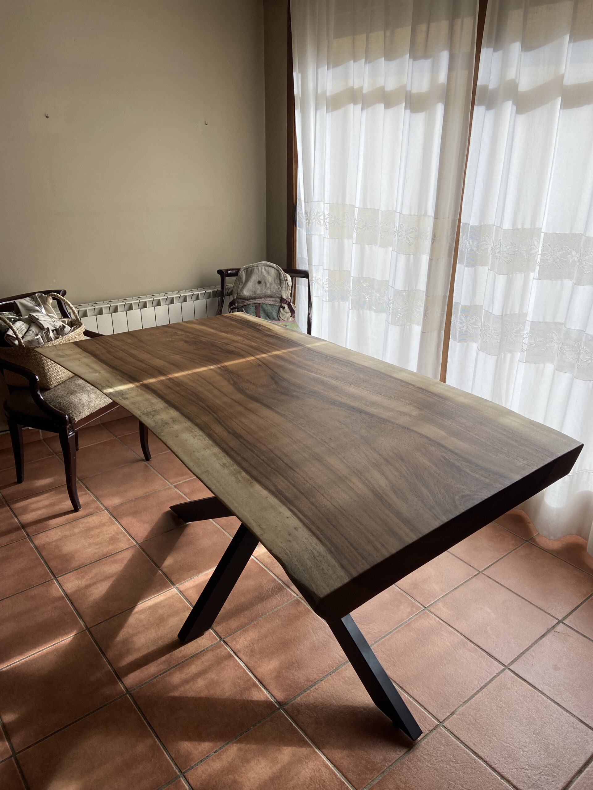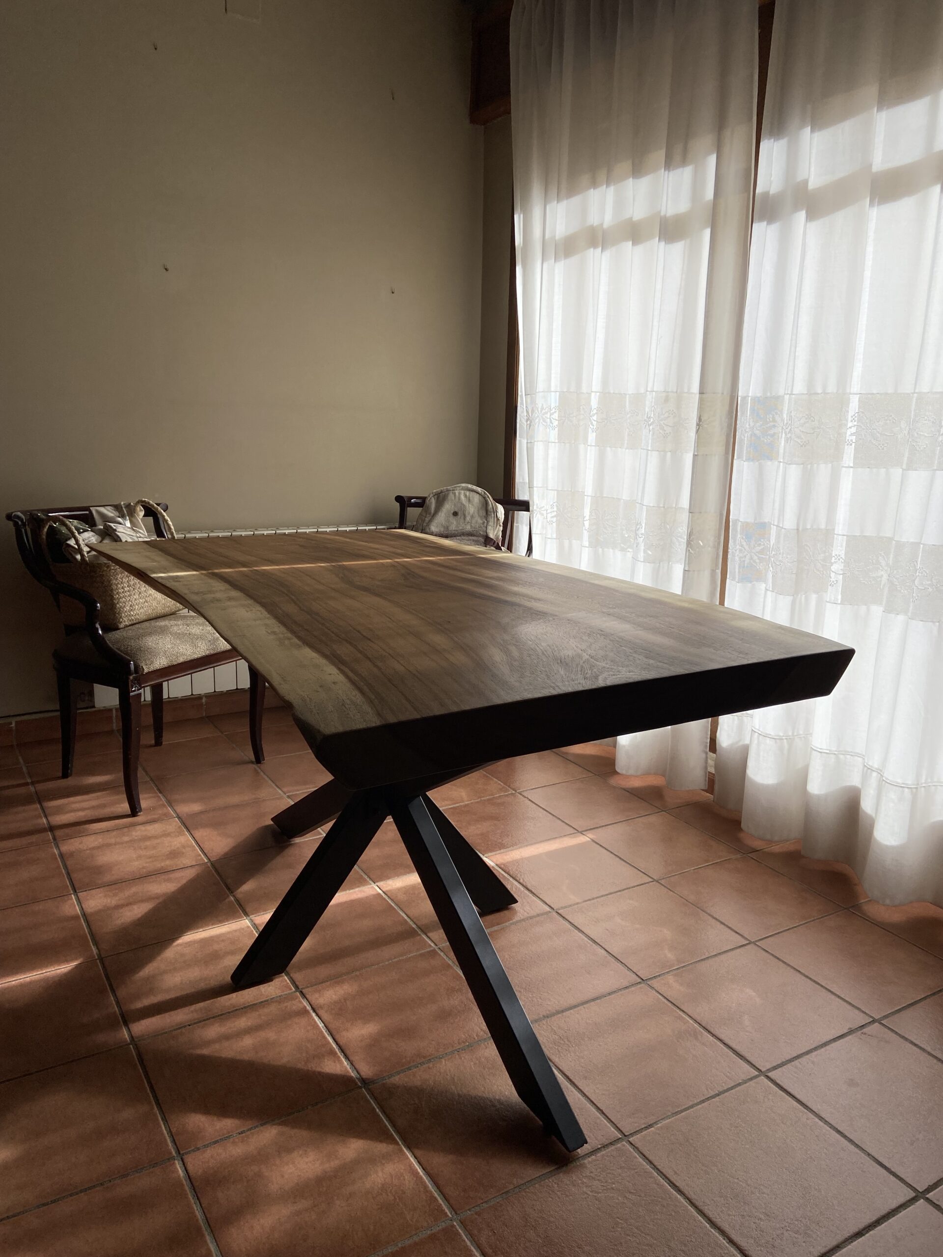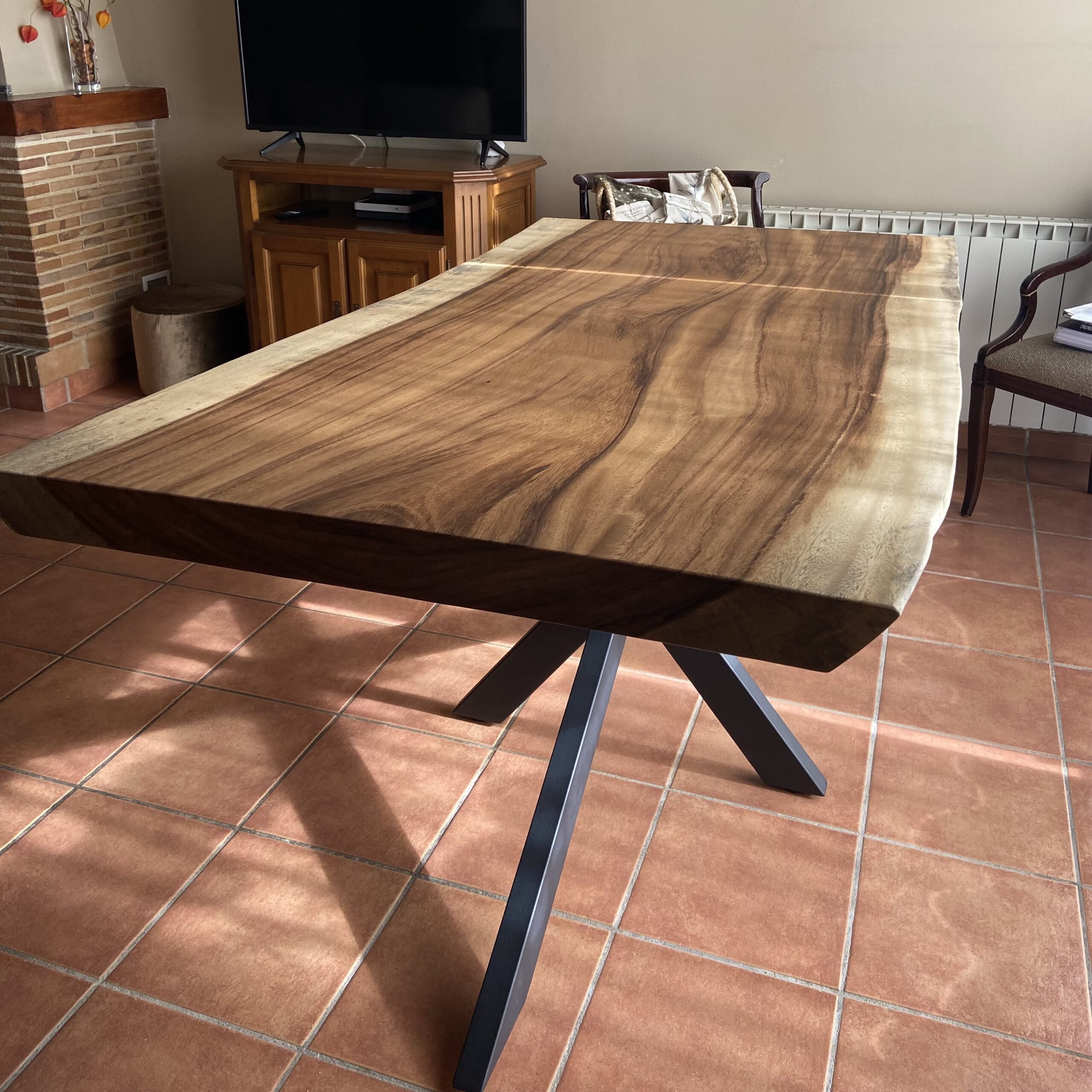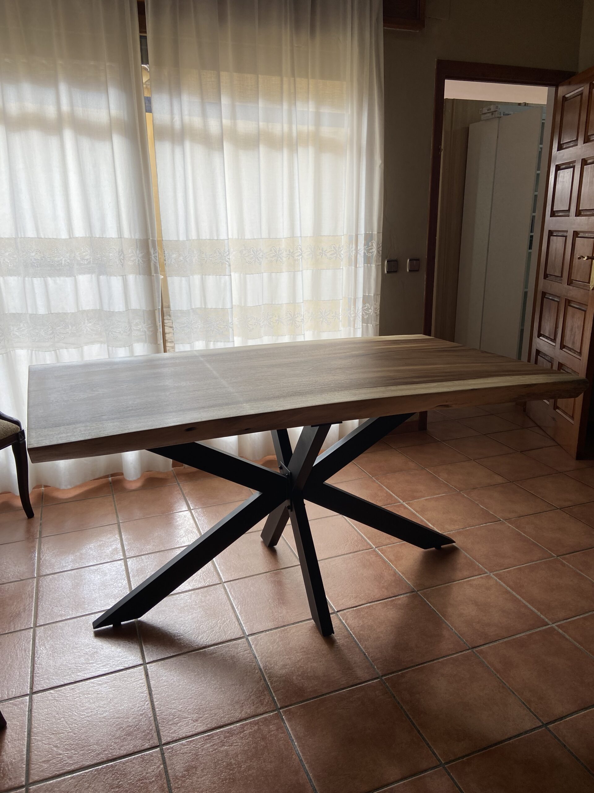 Las patas de esta mesa son metálicas, tipo “Araña”, y están fabricadas con un perfil de 80×40 mm pintado en color negro. Este diseño le da un toque moderno y resalta la belleza de la madera de saman, creando un equilibrio visual entre lo natural y lo industrial. La forma “Araña” de las patas aporta estabilidad y un aspecto único que complementa a la perfección el encanto de la madera.